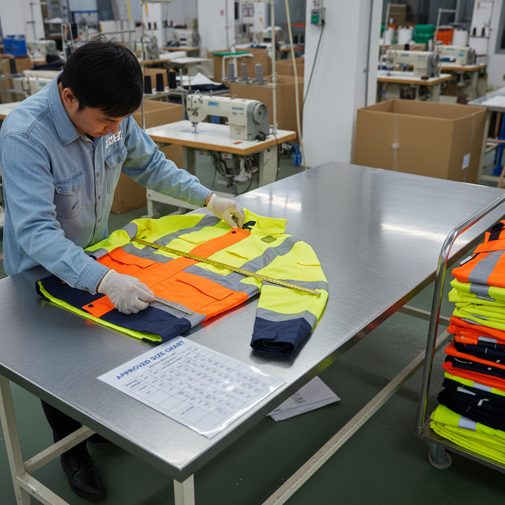 Key points such as chest, length, sleeve, and waist are measured against the approved size chart. This keeps fits consistent across sizes and repeat orders.
