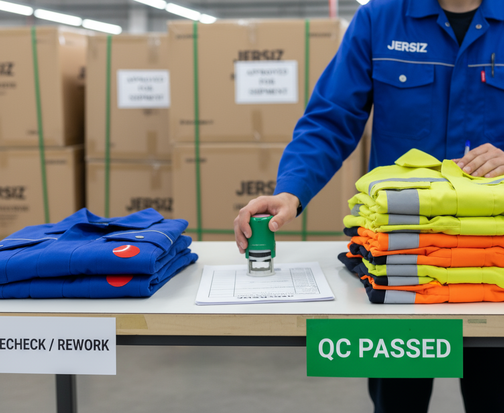 Only garments that pass this inspection are approved for packing and shipment. If we find issues above our internal tolerance, we re‑check the batch, rework where possible, or replace affected pieces before dispatch.